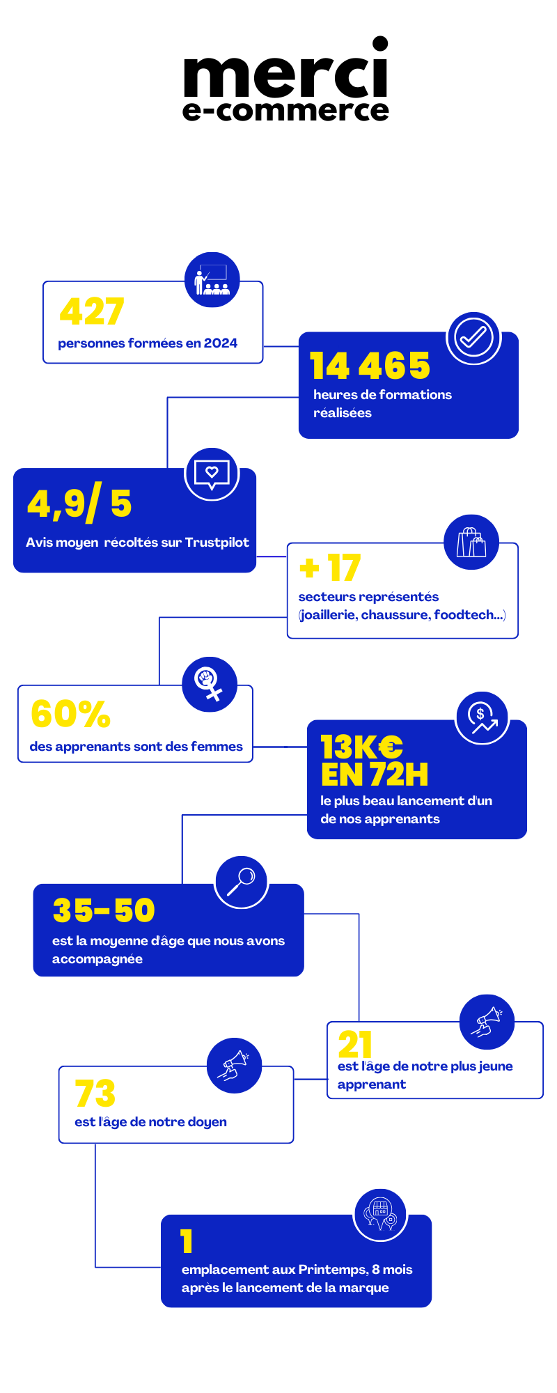En 2024, Merci E-commerce a consolidé son rôle de partenaire privilégié des TPE et PME en matière de formation et d’accompagnement sur Shopify. L’année a été marquée par l’enrichissement de notre plateforme d’apprentissage avec plus de contenus pratiques, le renforcement de notre expertise grâce à de nouveaux partenariats stratégiques et l’ouverture d’un bureau à Marseille, venant compléter notre présence parisienne. Ces évolutions nous ont permis d’accroître notre proximité avec les entrepreneurs, de diversifier nos formats pédagogiques et de poser les fondations d’une croissance durable pour les années à venir.